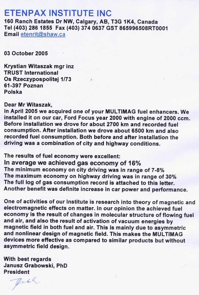 Instytut Badawczy ETENPAX Institute Inc. w Kanadzie potwierdza dużą skuteczność MULTIMAGÓW.